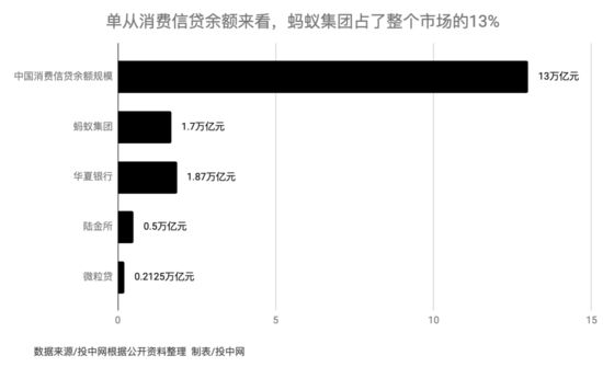 2019年,中国消费信贷余额规模达到13万亿元。单从消费信贷余额来看,蚂蚁集团1.7万亿的规模已经占到整个市场的13%。
