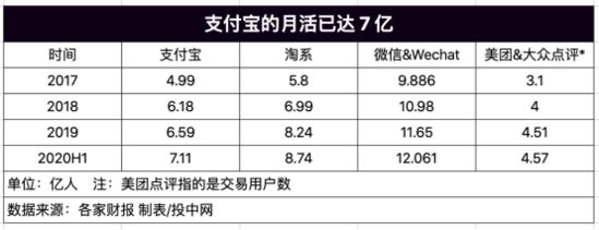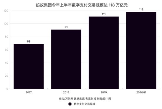 但最近几年,蚂蚁平台的支付交易规模也逐渐触达天花板。2018年数字交易规模从上一年的69万亿元增长至91万亿元,增长率超过30%;2019年达到111万亿,增长率下降至22%。2020上半年虽然在疫情影响下,数字交易规模依然取得7万亿元增长,但增长率进一步下降。