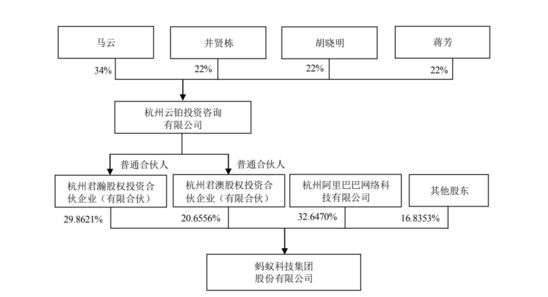 第一是阿里系高管和员工的两大持股平台杭州君瀚和杭州君澳(简称“两君”),合计持有蚂蚁50.52%的股份;