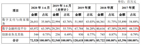 2019年度及2020年1-6月,数字金融科技平台收入占公司总收入的比例分别达到56.20%和63.39%。