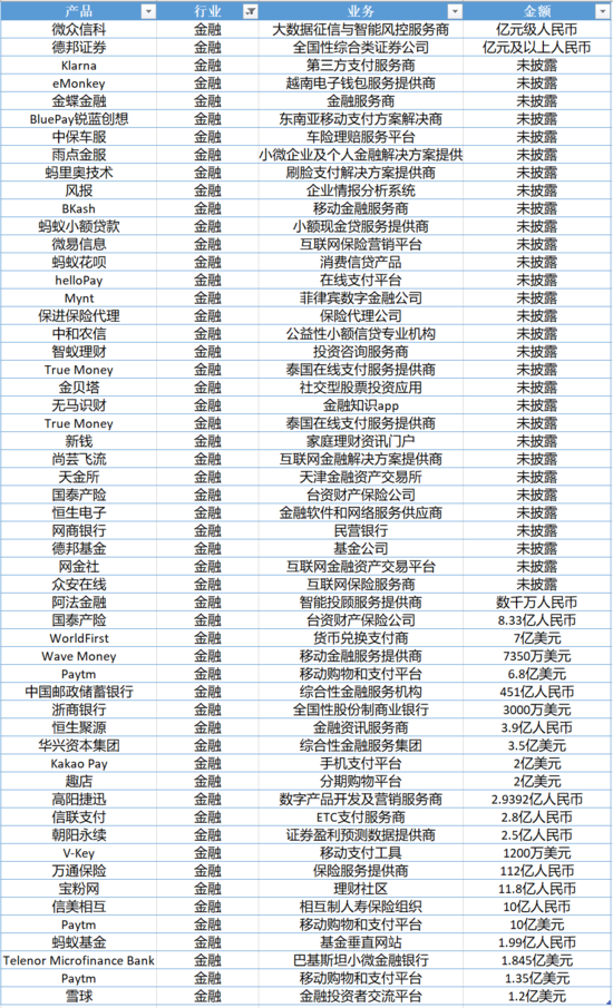 在金融领域,蚂蚁的投资版图最广、投资次数最多,涵盖了支付、风控、互金、保险、理财、保险代理等多个细分领域,投中网不完全统计如下: