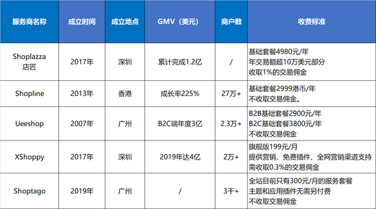 Ueeshop则是早期存活下来的独立站服务商,其母公司2007年成立于广州,是国内首个外贸自建站平台。目前,其服务的商户数量超过23000家,其中B2C年度交易额达3亿美元。2019年平台GMV保持了60%以上的增长,用户增长也很快。