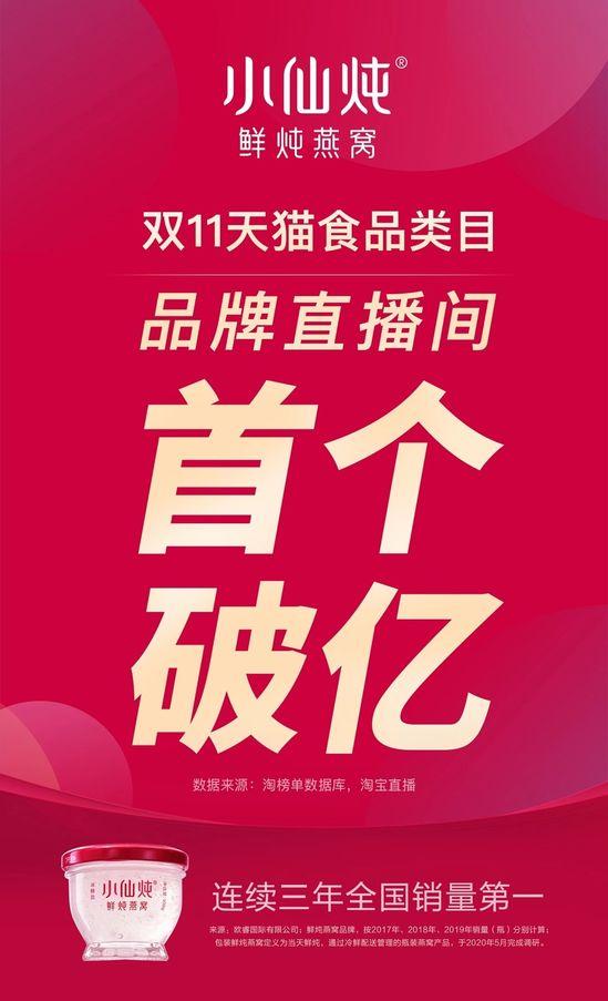小仙炖双11战报:天猫直播间销售额破亿 亿邦动力网 2020-11-11 00:41 【亿邦原创】11月11日消息,鲜炖燕窝品牌、马蹄社成员企业小仙炖天猫直播间销售额破亿,成为天猫双11食品类目首个直播间破亿的品牌。 文章来源:亿邦动力网 单篇购买 点击查看全文