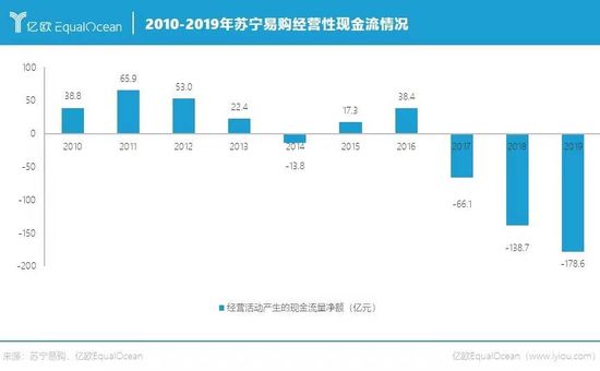 苏宁易购的经营性现金流量净额自2012年开始下跌,2014年由正转负。2015-2016年迅速回升,然而到2017年又跌至负66.1亿元。其后两年,苏宁易购的经营性现金流量净值逐年下降,2019年达负178.6亿元。