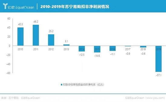 2012年,苏宁扣非净利润迅速下降,2013年,已跌至3.1亿元。然而这还只是开始,2014-2019年,苏宁的扣非净利润再无正值。2019年达到最低点,为负57.1亿元。