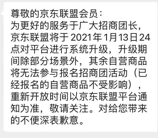 有京东联盟招商团长收到了京东联盟相关运营人员发布的一则通知。根据通知截图,京东联盟称为更好的服务于招商团长,京东联盟将于2021年1月13日24点对平台进行系统升级,升级期间除部分场景外,其余自营商品将无法参与报名招商团活动。