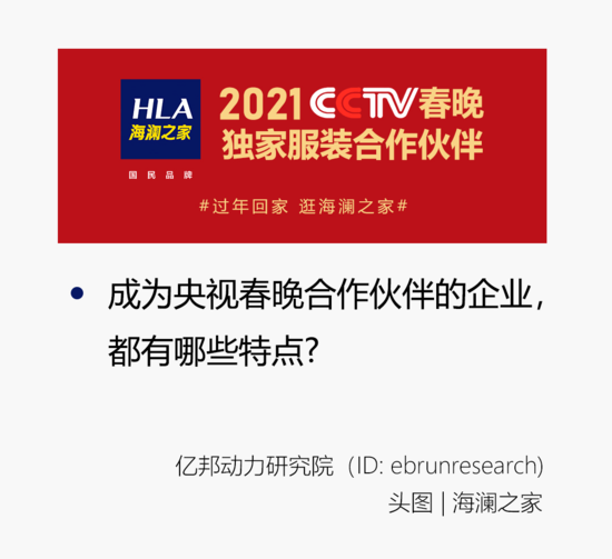回顾央视春晚历年合作伙伴,所处行业从钟表到出行、从美酒到电子产品,再从空调电器到互联网,每一次都紧贴大众的日常生活,涉及到食、住、行的方方面面。在牛年即将到来之际,海澜之家作为国际化一站式的男装零售企业,成为了春晚历史上首个合作的服饰品牌,在“衣”领域拔得头筹,通过央视舞台向全球华人问好,形成国民品牌和国民晚会的强强联合。