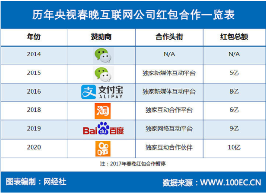 进入互联网爆发的时代后,春晚也开始紧跟时代潮流,引入更加多元的玩法。自2014年起,春晚从“台长工程”升级至“国家项目”。同年,微信将中国人春节习惯发送的红包放到了APP里。此后的5年间,腾讯、阿里、百度、快手等互联网巨头开始轮番上阵,成为春晚的独家互动平台伙伴,发出的红包总额超过38亿元。