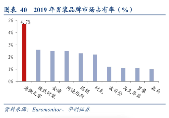 如今,最新一届央视春晚合作伙伴海澜之家,不仅同为行业领跑企业,并且与央视缘分匪浅。最初,海澜之家恰好就是以一只央视广告“出道”,让“男人的衣柜”深入人心,使当年的男人们都成为了品牌的拥趸。经历近20年的洗礼,海澜之家依然以4.7%的市占率连续6年位列中国男装行业第一,在男装行业龙头地位稳固。根据2019年全年财报,海澜之家股份有限公司实现营收219.7亿元,同比增长15.09%,和安踏共同成为本土服饰品牌中仅有的两位“两百亿俱乐部”成员。