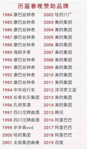 正因如此,春晚已然是名副其实的传播量最多、覆盖面最广、影响力最大的推广平台之一,每年的合作名额成为了各品牌的兵家必争之地。但春晚作为国民级IP,对于同台合作的品牌要求极高。无论是从前还是现在,能在全国企业中脱颖而出获得央视春晚赞助冠名权,都足以证明企业的绝对实力和行业代表性。回看历年的春晚合作伙伴,我们发现了其中的共性与趋势。