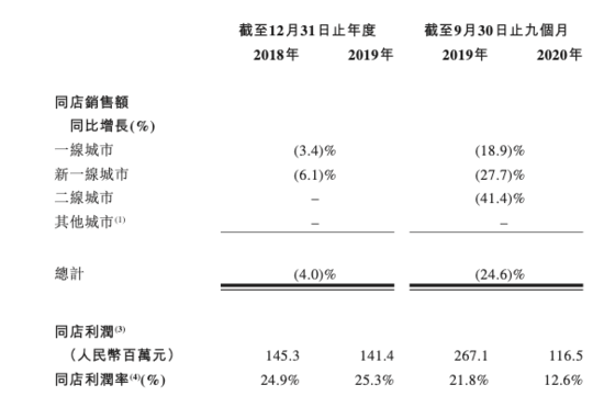 高端现制茶饮单店投入较高,对选址有比较苛刻的要求,这限制了快速扩张的可能。从实际运营情况来看,奈雪同店销售额及利润均有不同程度的下滑,并且从一线城市到新一线城市,再到二线城市,2020年前三季度同店销售额较2019年同期同比下滑幅度逐步变大。