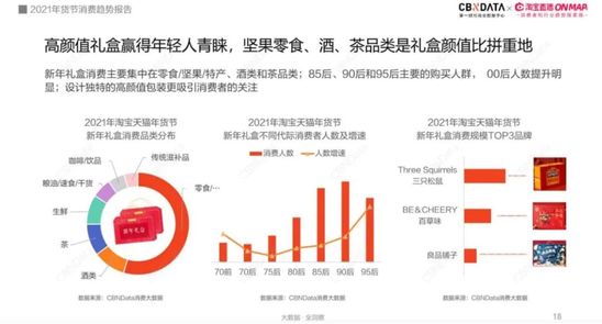 除了在家自己吃,过年过节也要给亲朋好友送送礼物。高颜值礼盒赢得年轻人青睐,老少皆宜的零食/坚果礼盒占比最高,三只松鼠、百草味、良品铺子等零食坚果大礼包成为新年礼盒消费规模TOP 3品牌。