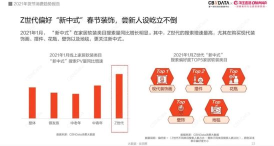 相比中老年和中青年,Z世代对传统+现代的“新中式”家居装饰风格反而更为偏爱,现代装饰画、摆件、花瓶成为2021年1月Z世代“新中式”搜索偏好度TOP 3类目。从北欧ins风到日式温馨风格再到新中式,Z世代的喜好也在一定程度上代表了前沿的潮流风格。
