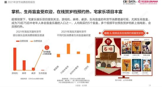 娱乐活动方面,掌上游戏机、麻将、桌游在年货节期间的消费规模非常可观,也成为春节合家欢的典型娱乐方式。此外,生肖+盲盒的配置搭配也吸引了70后、75后的目光,人均购买约5个盲盒。