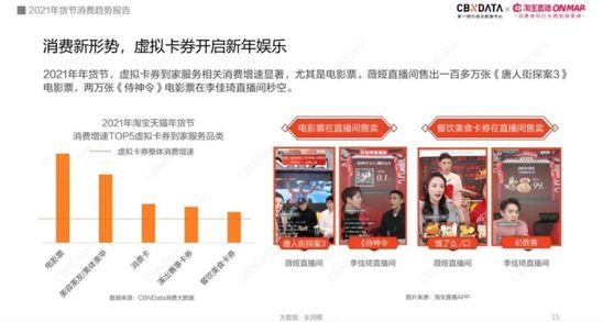 年货节期间,电影票成为虚拟卡券消费增速TOP 1。而直播间也成为了电影宣发的新阵地,《唐人街探案3》借助薇娅直播、《侍神令》来到李佳琦直播间,两位超头部主播也为电影前期的宣传和预售造势。