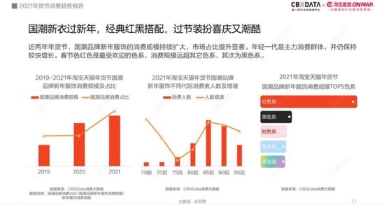 85后、90后是年货节期间国潮服饰消费的坚定拥趸,95后群体规模虽然不大,但增速明显,是国潮服饰的潜力群体。在颜色选择方面,国潮爱好者对红色的喜爱最为明显,恰逢春节,国潮红也是新年红。而在颜色搭配方面,黑色作为“酷”的象征,也与国潮融为一体。