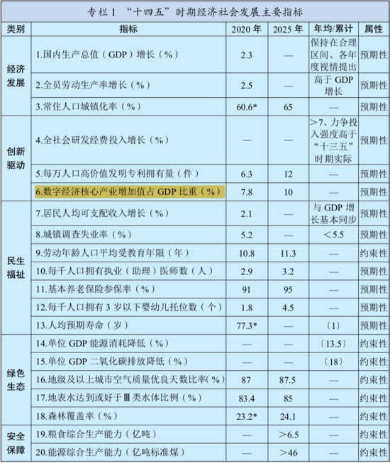 3、第一篇-第三章-第二节“十四五”时期经济社会发展主要目标中,“数字经济核心产业增加值占GDP比重”首次成为体现创新驱动的指标。