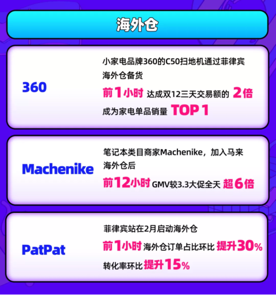 此外,Lazada海外仓中,小家电品牌360的C50扫地机,通过菲律宾海外仓备货。前1小时达成双12三天交易额的2倍,成为家电单品销量TOP1。笔记本类目商家Machenike,加入马来海外仓后,前12小时GMV较3.3大促全天超6倍。PatPat菲律宾站在2月启动海外仓,前1小时海外仓订单占比环比提升30%,转化率环比提升15%。
