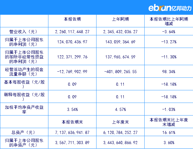 | 归属于上市公司股东的净利润(元) | 124,070,436.97 | 143,059,364.69 | -13.27% |