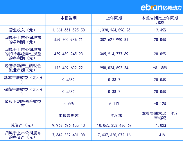 | 归属于上市公司股东的净利润(元) | 459,300,986.21 | 382,627,990.81 | 20.04% |