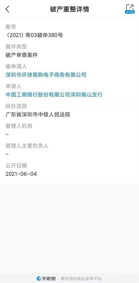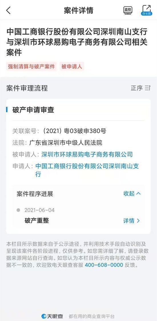 根据天眼查发布的信息,目前,该案件类型属于破产审查案件,申请人是中国工商银行股份有限公司深圳南山支行,被申请人是深圳市环球易购电子商务有限公司,经办法院为广东省深圳市中级人民法院,公开日期为6月4日。目前,该案件正在审理流程中。