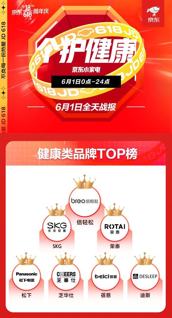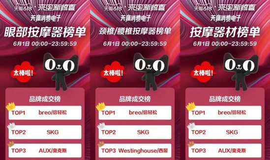 6月2日消息,马蹄社成员企业、便携式按摩器品牌倍轻松发布618首日战报。6月1日0点至24点,倍轻松获天猫618眼部按摩器类、颈椎/腰椎按摩器类和按摩器材类三大品牌成交榜第一名,同时获得京东小家电健康类品牌TOP榜第一名。
