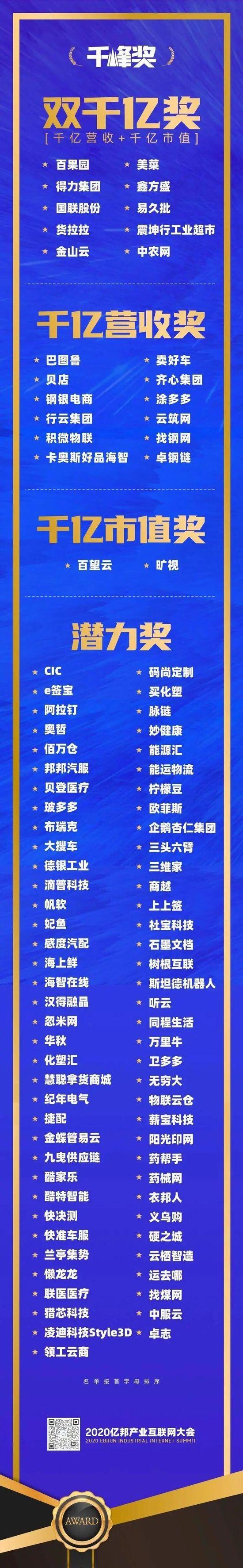 “千峰奖”是由亿邦动力举办的评选活动,希望挑选出具有双千亿基因(营收和市值)的产业互联网代表企业。千峰奖设置有双千亿(千亿营收+千亿市值)、千亿营收奖、千亿市值奖、潜力奖四个奖项。通过50+投资机构对参选企业实现千亿营收+千亿市值的可能性高低进行投票,经过亿邦初审、46位投资机构与机构代表投票、9位投资人终审产生获奖名单。