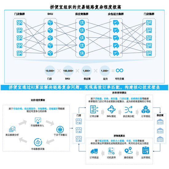 便利店,包括传统夫妻店和杂货铺,通常面临议价无优势、进货周期长、信息不对称、资金压力、货品滞销、账务混乱等各种各样的问题,拼便宜通过数据采集及AI算法的应用,实时分析城市内不同供应商的价格、配送周期、物流成本、商品库存等有效数据,为便利店的采购配送推荐全局最优匹配方案。