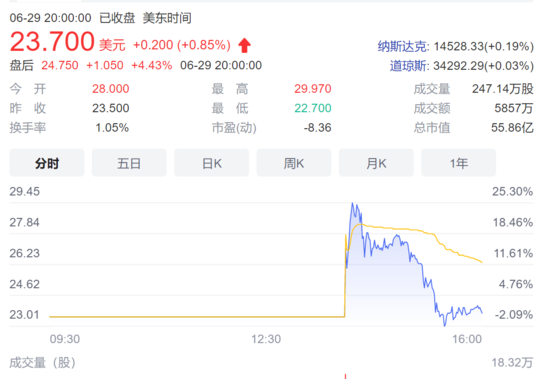 此外,每日优鲜于6月22日更新招股书,提前4天于6月25日在纳斯达克上市。随之而来的是,上市开盘即破发,跌幅迅速扩大,收盘大跌25%,上市第二个交易日大跌8.49%!