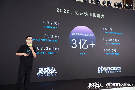(PPT图示)这是今年财报公布的2020年的一些数据,公布的数据中显示日活突破3亿,并且前段时间对外发布的是全球的APP月活破10亿,活跃用户7.7亿,内容创作者在25%,我想说的就是,很多人问我,快手电商或者说快手这个平台是是不适合品牌做,或者只能够卖低端货,怎么理解快手应该怎么做。我想回答一下,作为去年达到三亿日活、现在平均日后3.792亿的APP来说盘子非常大,里面包罗万象,有三四线用户群体,也有一二线的用户,所以说不用担心你的货在我们这里能不能卖,而考虑的是你在这里如何卖,如何适应平台的发展以及适应平台内容。