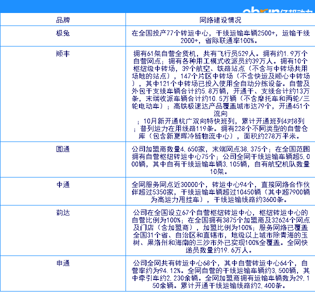 | 中通 | 全网服务网点近30000个,转运中心94个,直接网络合作伙伴超过5350家,干线运输车辆超过10450辆(其中超7900辆为高运力甩挂车),干线运输线路约3600条。 |