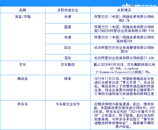 | 淘宝/天猫 | 中通 | 阿里巴巴(中国)网络技术有限公司持股8.7% |
