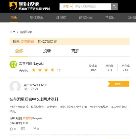 光在黑猫投诉APP上,截止今年8月5日,奈雪的茶接到的投诉量就高达427次,其中食品安全问题是消费者投诉的重灾区。