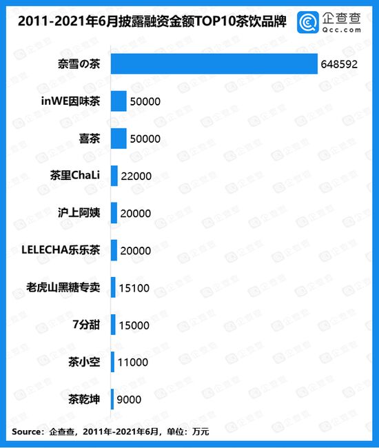 从茶饮品牌的融资总金额来看,企查查数据显示,截止2021年6月,“奈雪的茶”以64.86亿元摘得魁首,高端新式茶饮品牌“inWE因味茶”、喜茶则各以5亿元并列第二。