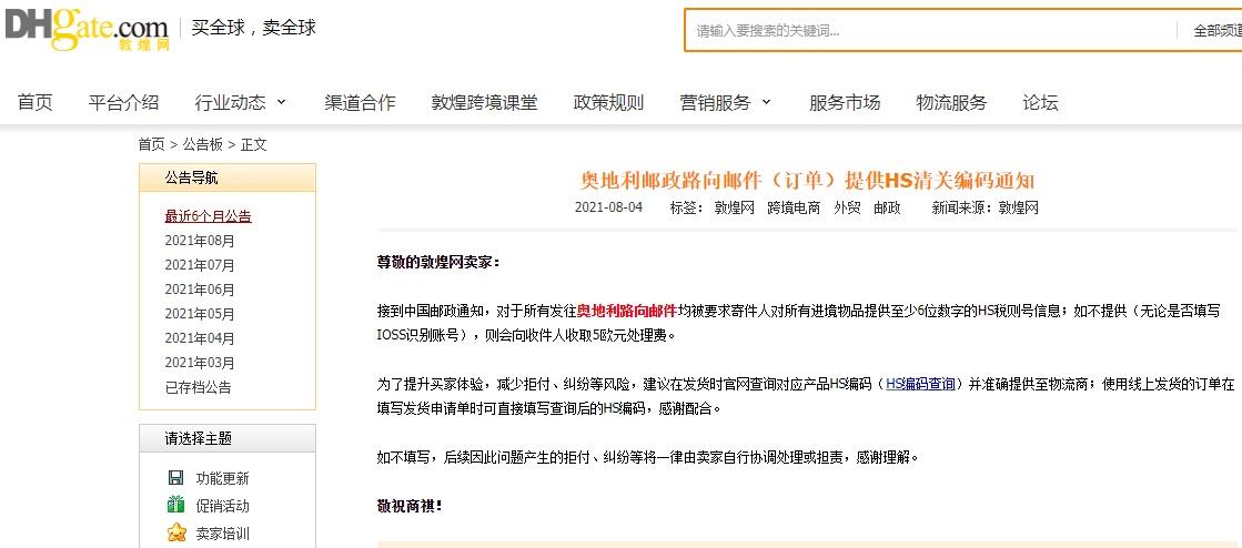 此前,敦煌网曾在8月4日发布奥地利邮政路向邮件(订单)提供HS清关编码通知,接到中国邮政通知,对于所有发往奥地利路向邮件均被要求寄件人对所有进境物品提供至少6位数字的HS税则号信息;如不提供(无论是否填写IOSS识别账号),则会向收件人收取5欧元处理费。