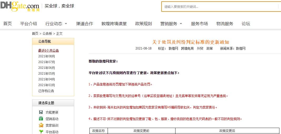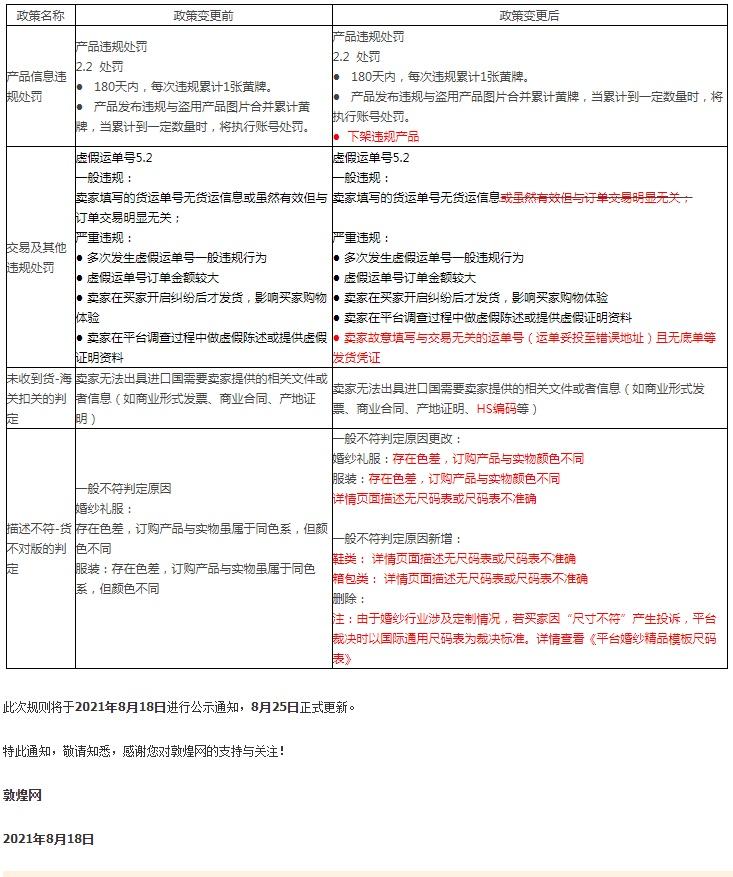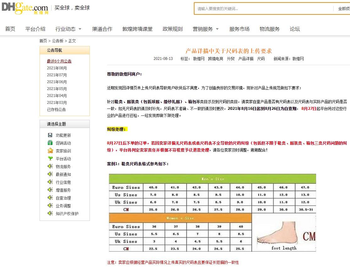 此外,敦煌网还在8月13日发布产品详描中关于尺码表的上传要求,针对鞋类、服装类(包括球服、婚纱礼服)、箱包等类目涉及到尺码的类目,请卖家自查产品是否有尺码表以及尺码表与实际产品的尺码是否一致,如无尺码表的请及时补充,尺码表不准确、不一致的请及时更改,2021年8月16日起到8月26日为自查期,8月27日起平台将对这些行业的产品进行巡检,一经发现即做下架处理。
