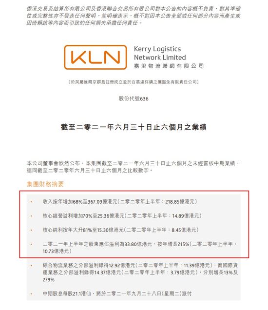8月28日消息,嘉里物流发布截至2021年6月30日止6个月业绩,收入按年增加68%至367.09亿港元;核心经营溢利增加70%至25.36亿港元;核心纯利按年大升81%至15.30亿港元;2021年上半年的股东应占溢利为33.80亿港元。中期股息每股21.1港仙,将于2021年9月28日派付。
