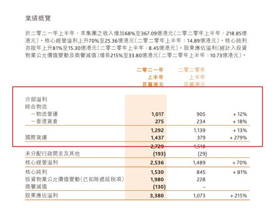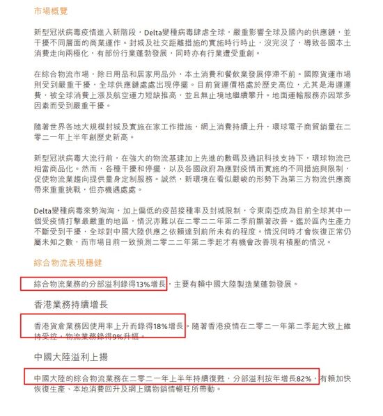 在中国香港地区,货仓业务因使用率上升而录得18%增长。随着香港疫情在2021年第二季起大致上维持受控,物流业务录得9%升幅。在中国内地,综合物流业务在2021年上半年持续复苏,分部溢利按年增长82%,有赖加快恢复生产、本地消费回升及网上购物销情畅旺所带动。在中国台湾地区,综合物流业务分部溢利维持稳定,录得5%增长。