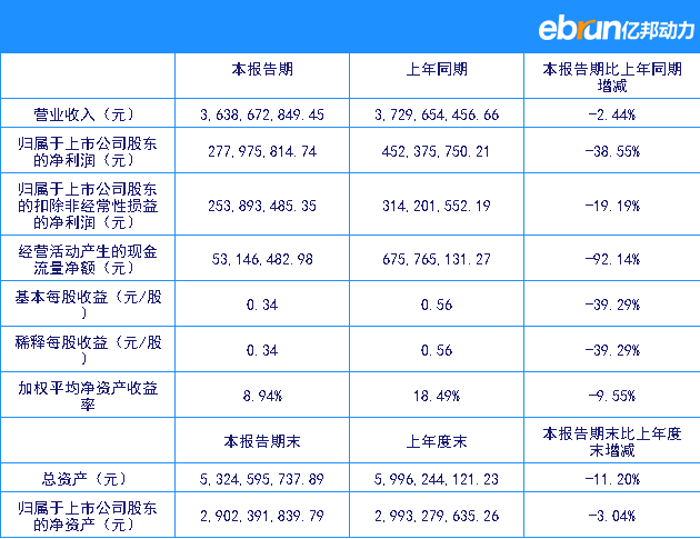 | 营业收入(元) | 3,638,672,849.45 | 3,729,654,456.66 | -2.44% |