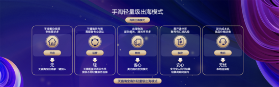 从这一趋势出发,今年5月,天猫淘宝海外提出了“轻松出海”理念,商家只需在天猫淘宝后台勾选仓库、商品要覆盖的境外区域,即可一键加入出海生意,触达天猫淘宝的境外消费者,实现“一店卖全球”。