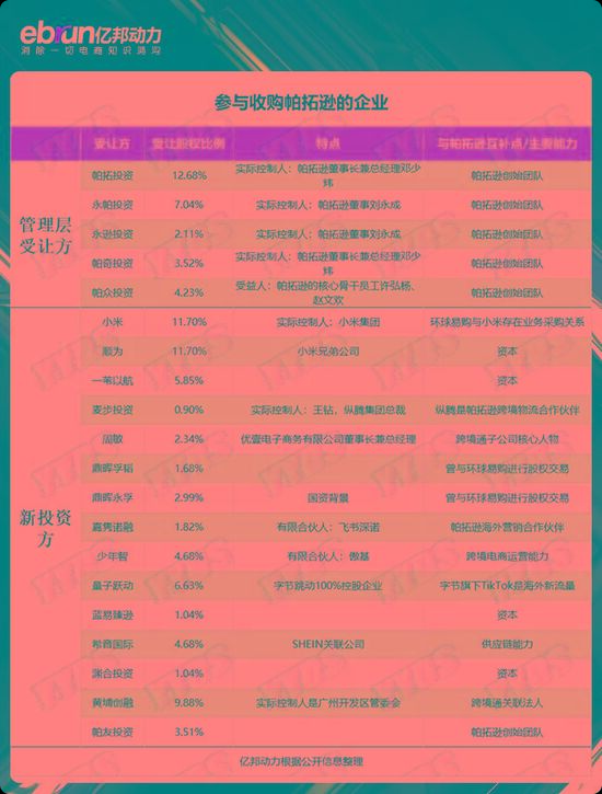 3月23日晚间,跨境通再次发布公告称,拟以20.2亿元转让帕拓逊100%股权,受让方包括小米、顺为、量子跃动(字节跳动关联企业)、希音国际(SHEIN关联公司)等20家公司。