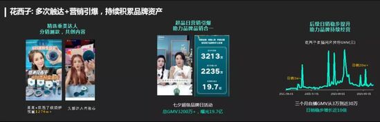 他们认为每一个对消费者的触点都会通过数据银行这样的产品沉淀成认知人群、兴趣人群、购买人群等等用户资产。他们希望通过快手电商的内容传播东方美的品牌理念。他们用产品力、品牌力触达用户6-9次的时候进行用户漏斗的流转,他们代表更追求品牌力的品牌,所以我不太会讲在大的节点上做了多少GMV,更重要的是在这边做完这次大促活动以后,日销有没有继续提升?所有营销活动的本质是能够提升你的日销的增长,这才是有意义的。