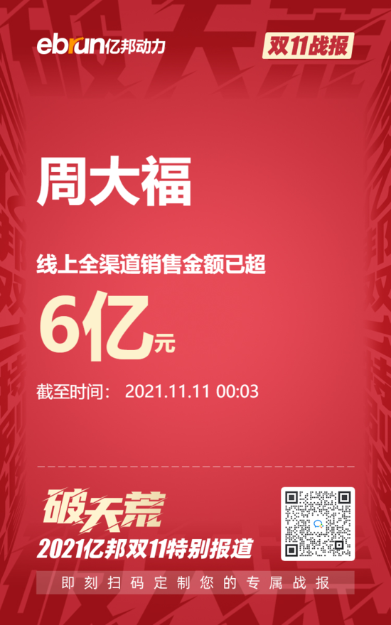 周大福双11战报:线上全渠道销售额超6亿元 亿邦动力 2021/11/11 00:10 11月11日战报消息,截至2021年11月11日0时3分,周大福线上全渠道销售额超6亿元。 【本文来源:Ebrun Go。亿邦开发的自动化写作机器人,第一时间以算法为您输出电商圈情报,这只狗还很年轻,欢迎联系run@ebrun.com 或留言帮它成长。】 文章来源:亿邦动力 单篇购买 点击查看全文