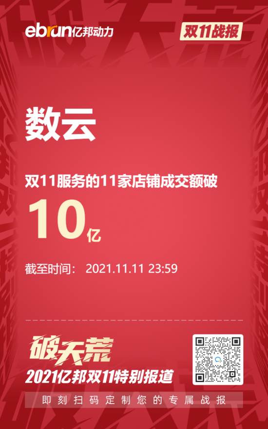 截止11月11日24点,共有11家数云服务的店铺成交额破10亿、104家店铺成交额破1亿、118家店铺成交额破5000万。