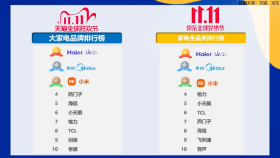 从市场表现力看,2021年度京东、天猫双11前3强排名相同,依次为海尔智家、美的、小米,而第9-10席上榜者各有不同,天猫为创维、老板;京东则由飞利浦、容声包揽。