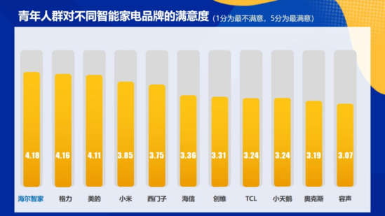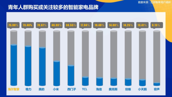 品牌影响力方面,海尔智家、格力、美的三强以七成以上的关注度断层式领先,其他品牌在青年消费者的认知心智上与头部梯队仍有较大差距。