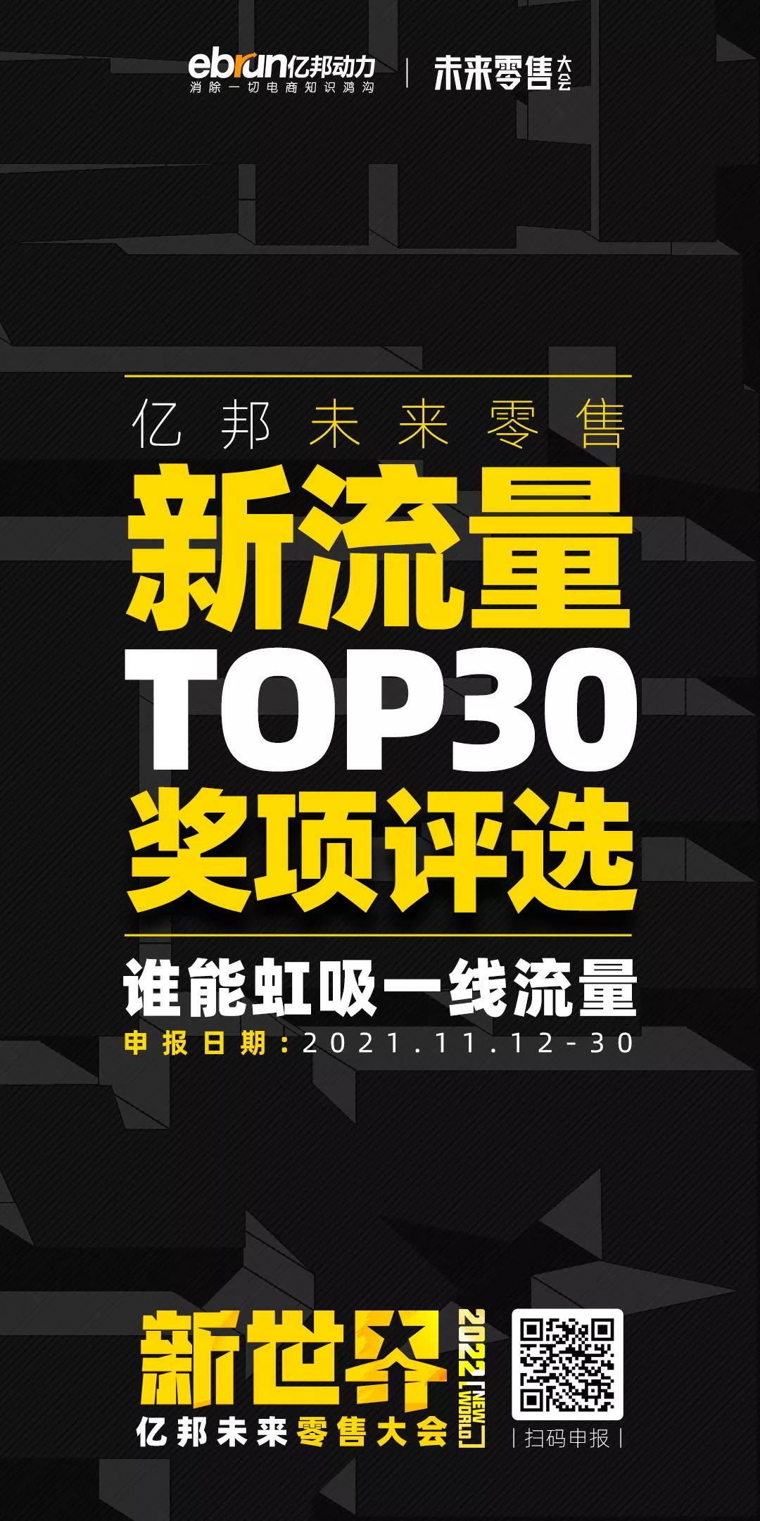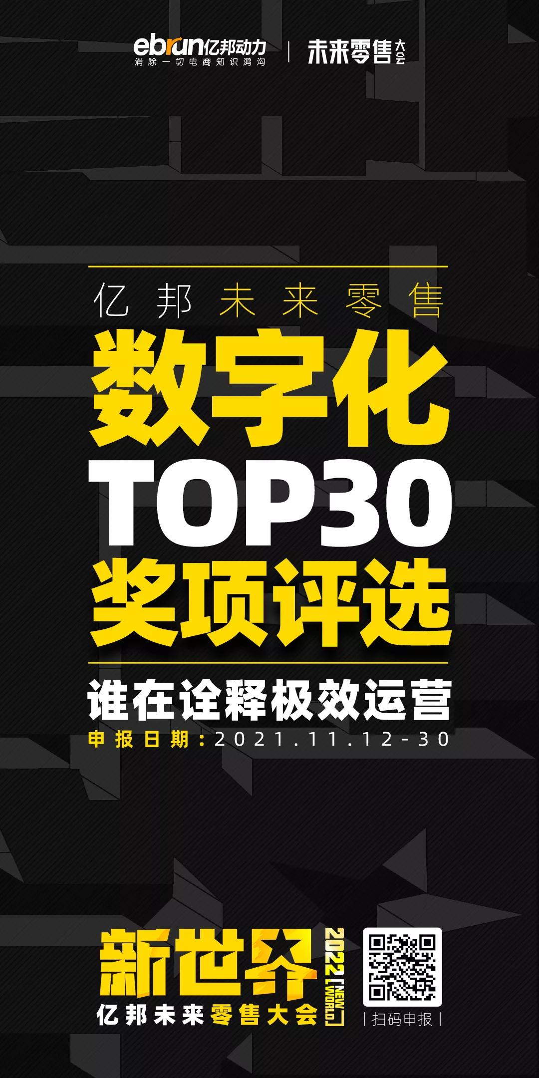 适逢此际,亿邦动力特别推出2021年度“亿邦未来零售大奖”、“新世界特别奖”两大专项奖及“亿邦未来零售新流量TOP30”、“亿邦未来零售新消费TOP30”、“亿邦未来零售数字化TOP30”、“电商服务商知识力排行榜TOP100”四大榜单。