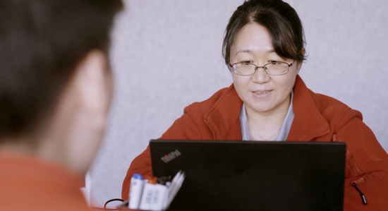 朴贞玉正在跟同事沟通相关工作。