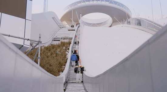 工程师们决定到高100多米的“雪如意”顶上去摸查清楚,但这天不巧,平时乘搭的缆车停运了,李弘鹏等人只能在零下10摄氏度的寒风中徒步爬上160米的陡坡。这个狭窄的通道在跳台滑坡的旁边,很隐秘,一般人察觉不到。