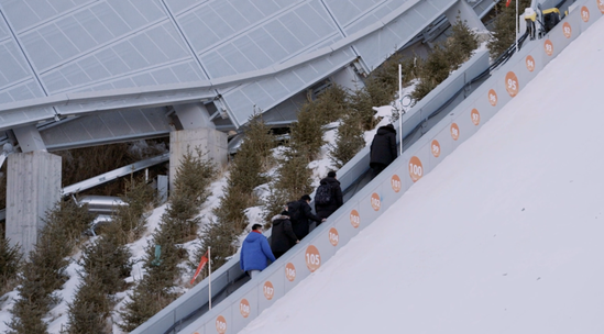 陡坡沿途是裁判评分点,是观看跳台滑雪比赛的最佳视角所在,当然,李弘鹏和陈艳是体验不到的。